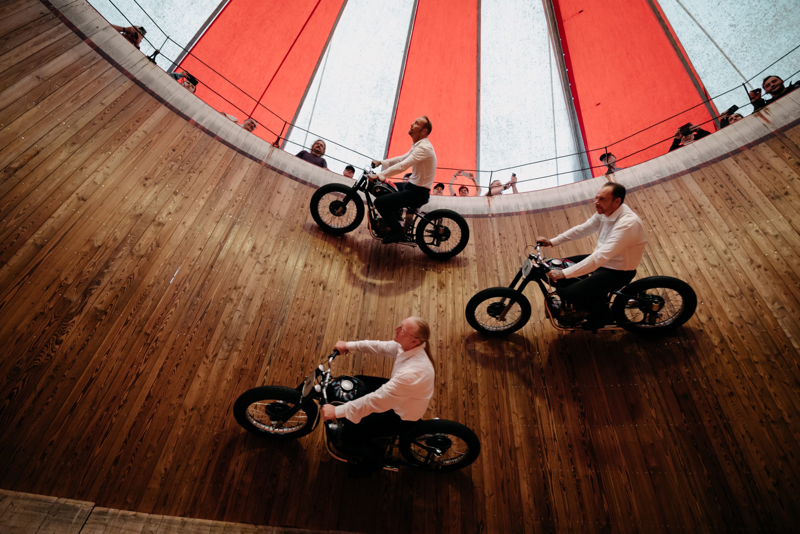 אחת האטרקציות המרכזיות ב- PURE&CRAFTED היה "קיר המוות". ביטוי מזוקק של רטרו אקסטרים שמאד נדיר לפגוש כיום. בינינו, כמה פעמים משכתם ווילי? כמה פעמים זה באמת הצליח? הפעלולנים במוטורדרום, אותו "קיר המוות", מתעלמים לגמרי מכוח המשיכה בזירה קטנה כשהם רוכבים על BMW R25 חד-צילינדרי קלאסי. מופעי הרכיבה האקרובטיים האלה מתקיימים ברצף, משעות אחר הצהריים עד הלילה (כל 30 דקות) ומשתתפים בהם, יחד בזירה שהיא לא יותר מחבית עץ ענקית, עד ארבעה רוכבים בו-זמנית הנעים בה בסנכרון מושלם.