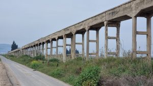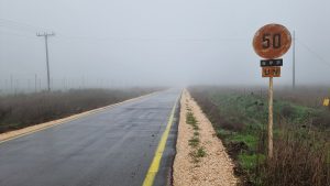 הכביש השבור הוא ציר הנפט המיתולוגי שתחתיו קבור צינור שהסיע נפט מהמפרץ הפרסי למסוף בצור. מן הסתם הקו הזה אינו פעיל עשרות שנים אבל תמיד הוא היה ציר תנועה מרכזי בגולן – היום פחות. אנחנו נמשיך עליו ברכיבה זהירה – בכל זאת הכביש שבור ומדי פעם יש בורות. בעונה הגשומה גם נחלים מדי פעם חוצים את הכביש בזרימה שמחה ונקיה – ואם ממש יש מזל גם נהנים מתקרת עננים נמוכה מאד.
