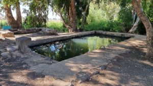 אחרי שכולם מכונסים נמשיך צפונה על כביש 90 עד לכיכר הראשונה בה פונים ימינה לפארק נהריים. נרכב מעל לסכר דלהלמיה ועוקבים אחרי סימון השבילים האדום – סימון זה מלווה אותנו במעבר דרך השטחים החקלאיים של עמק הירדן – בין מטעי בננות ואבוקדו – תצפיות מרתקות מזרחה לירדן וגם אקוודוקט – מוביל מים – שבני הקיבוצים בנו בשנות ה-50' כדי לתעל מים מנהר הירמוך לשדותיהם. הדרך המסומנת פונה ימינה ושמאלה פעמים רבות בחלקות הרבות לכן עוקבים אחריהם באדיקות ושומרים על מהירות נמוכה – יש כאן לא מעט תנועה של כלים חקלאיים.