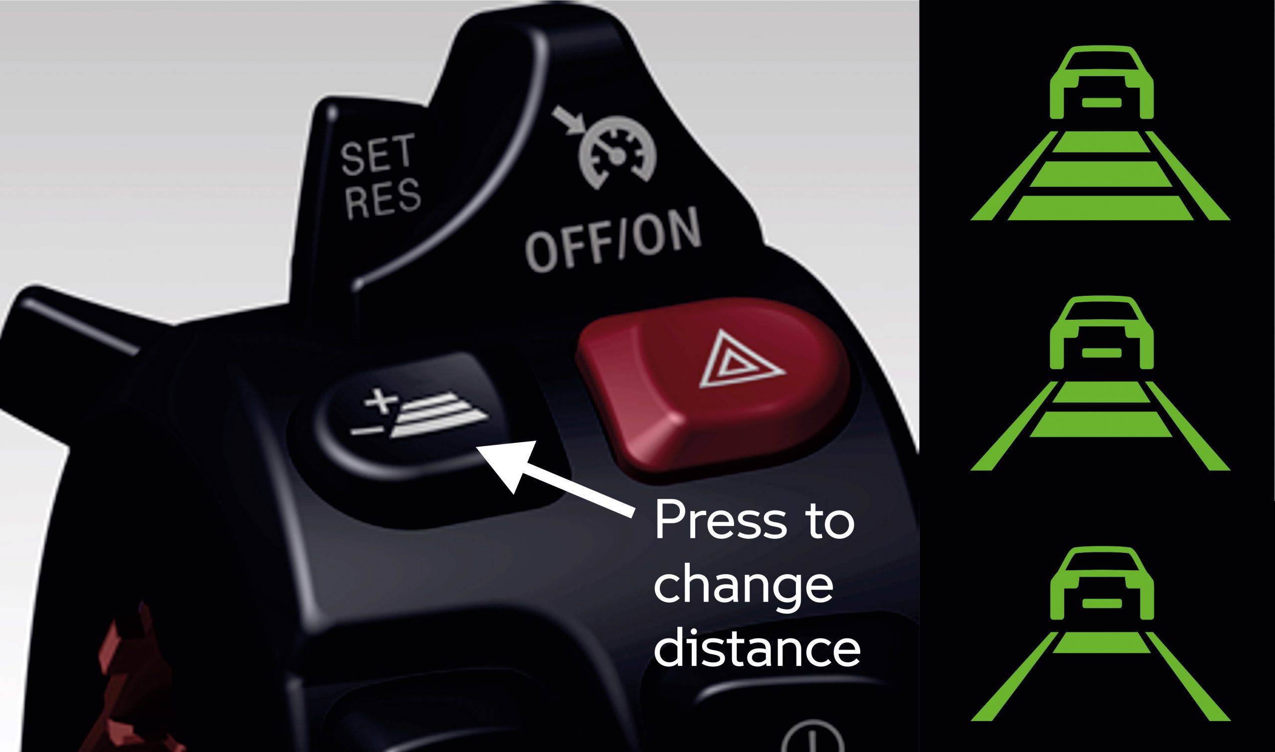 אז מה ה-ACC עושה בתנועה? המערכת תתאים באופן רציף את מהירות האופנוע לנתון מהירות השיוט שהצבתם ותגיב לשינויי המהירות של התנועה שסביבכם. בנוסף היא גם יודעת לשמור מרחק בטוח מהרכב או האופנוע שלפניכם, על פני שלושה רווחים שתגדירו מראש.