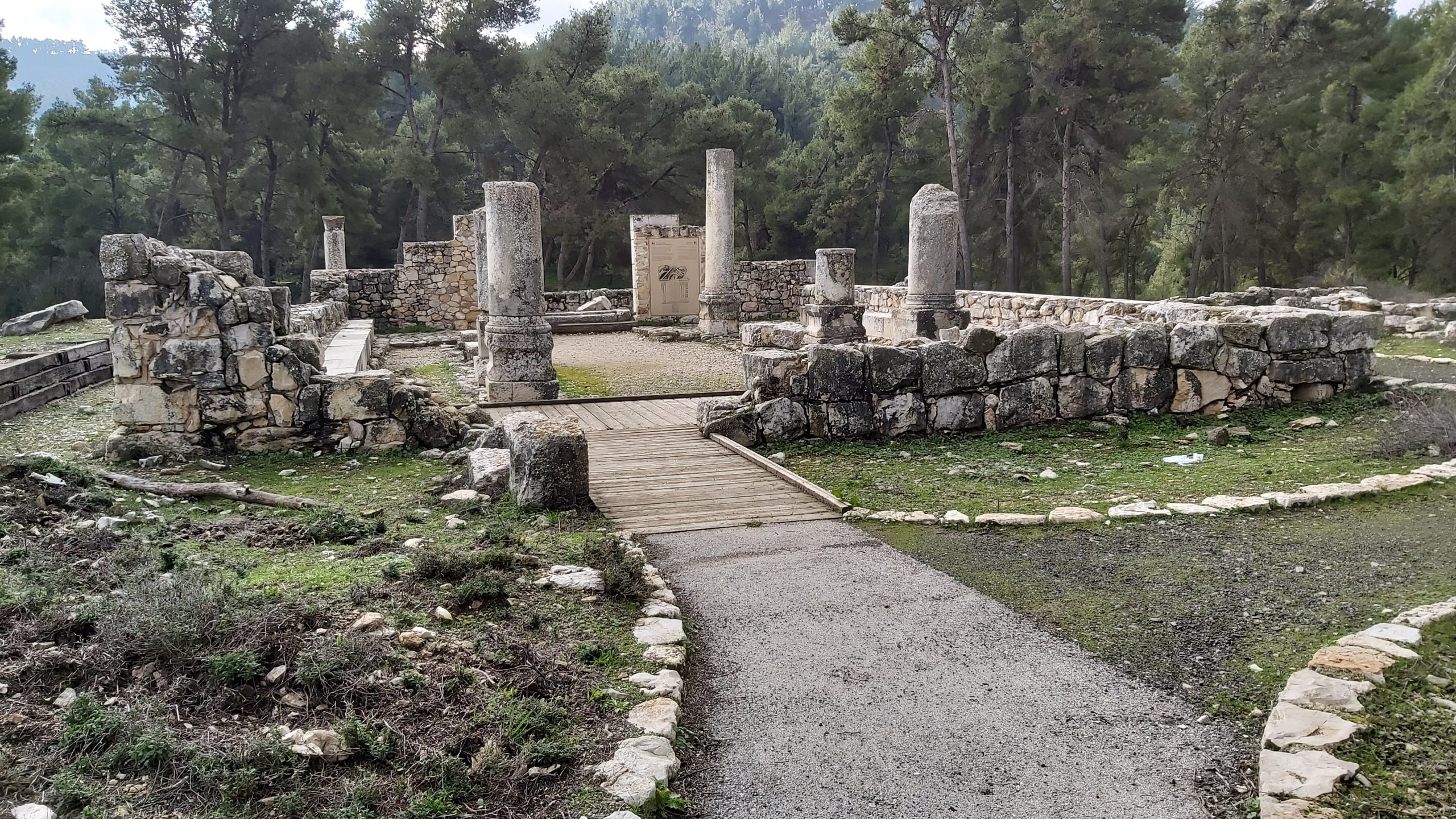 אחרי כקילומטר נגיע לעין גבר, בו יש מעיין שכבה איתן, שבעונה הזו אינו מאוד שופע – אבל מציע פינה מאד יפה למנוחה. נמשיך ואחרי שתי סרפנטינות חדות נראה מצד שמאל פתח נוסף אל היער, בתוכו עצים לא מוכרים. לאחר מכן, חוזרים אל הכביש וממשיכים עוד כשני קילומטרים, עד שמגיעים לבית הכנסת העתיק של נבוריה המתוארך למאה הראשונה לספירה.